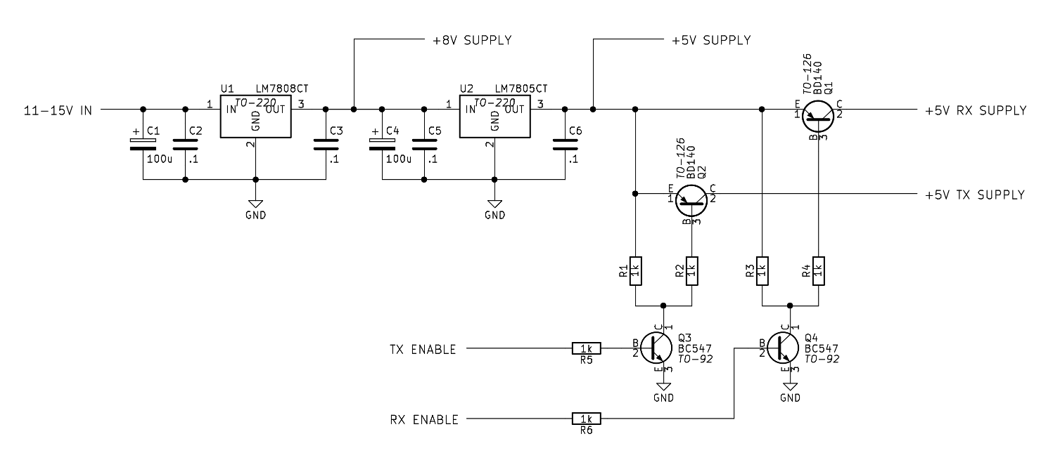 One thing I also added was a regulated power supply with RX TX switching. I decided to use linear regulators since they are generally quieter and doesn't generate spurs. They are ineffective and will require cooling but to me it's an okay trade-off.