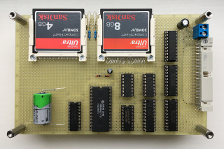 This is a picture of the board taken from the top. It's a standard euro board that fits nicely along with the other boards in my MC3 system. The Compact Flash cards are accessible from the long side of the board which is a bit unusual but since the MC3 boards are stacked and not placed in a frame they are accessible from all sides. When the picture was taken only one of the Compact Flash sockets was soldered in. It's pretty time consuming since the pins are so small and close together but the end result is pretty nice. The battery installation is more or less temporary. I've not yet found a solid socket solution that I like.