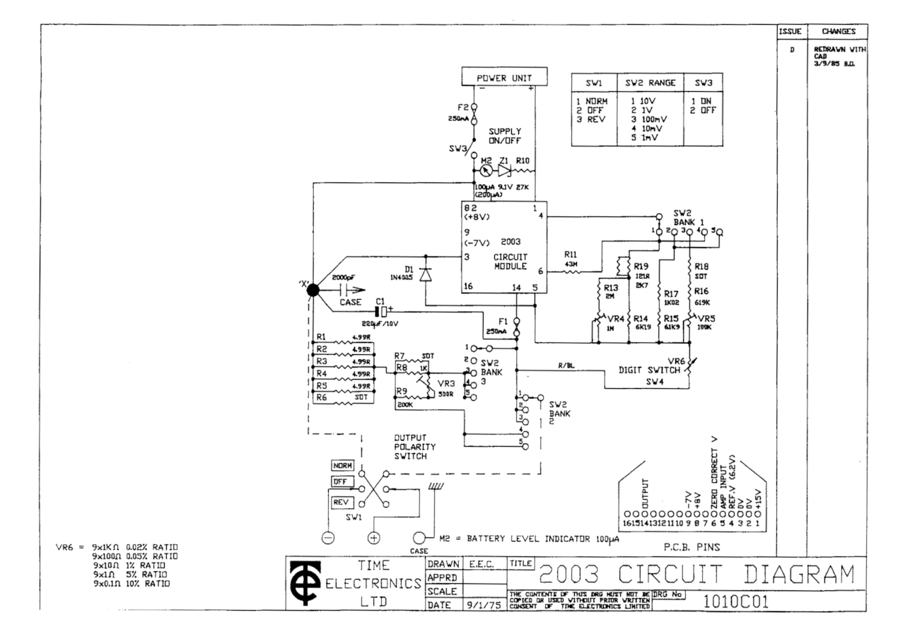 6. Select range 1 and adjust VR4 for 9.9999 V on meter
